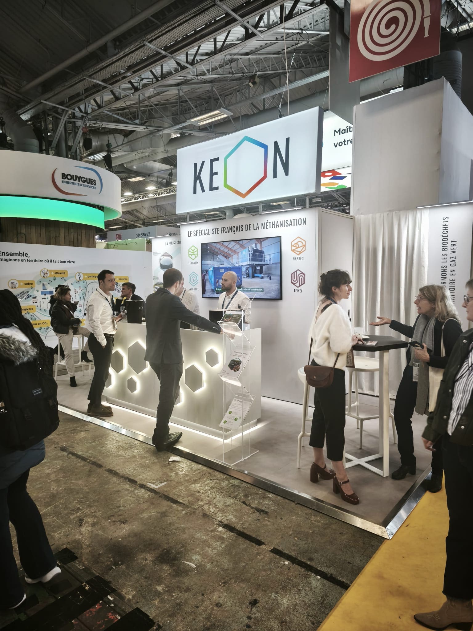 C’était le cas de Vinci Construction, qui a bénéficié d’un stand 100 % sur mesure : 100 m² structurés autour d’un espace réceptif, de zones dédiées aux solutions Revilo, Refresh, Power Road et Vélo, et d’une identité chaleureuse mêlant bois clair et végétalisation.